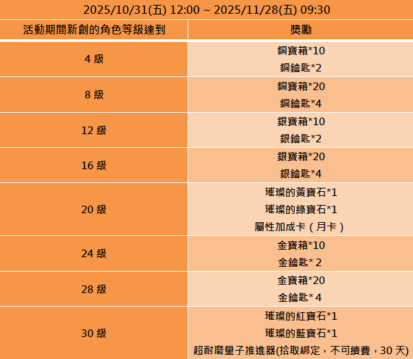 - 達成等級條件後,獎勵將立即透過遊戲內郵件寄送至角色信箱,請達成領獎條件的玩家留意遊戲信箱。