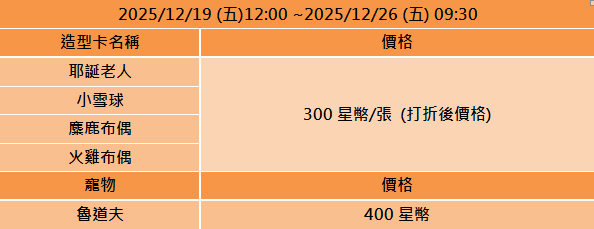 另外在12/12 12:00~12/19 9:30上架寶石禮包,12/19 12:00~12/26 9:30販售節日造型卡【耶誕老人、小雪球、麋鹿布偶、火雞布偶】及聖誕禮包,聖誕限定寵物小麋鹿【魯道夫】也同步登場,千萬別錯過,把牠帶回家一起過節吧!