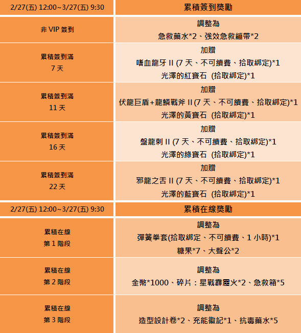 3月拿好禮,活動在線第一階段送【彈簧拳套 (1小時)】,第二階段送【碎片:星戰霹靂火*2】喔,第三階段還有【充能徽記*1、造型設計卷*2】!