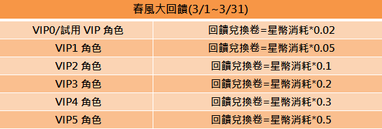 - 儲值獎勵回饋,活動期間的儲值星幣是以帳號計算,獎勵優先寄送給帳號中VIP最高的角色;若有兩隻以上角色VIP等級一致,則獎勵優先寄送給等級最高的角色;若有兩隻以上角色等級一致,獎勵則優先寄送給先創立的角色。