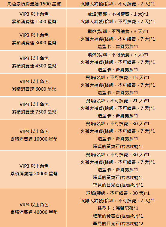 VIP3以上消費達20000星幣即可獲得【飛焰】30天、【璀璨的黃寶石】及【罕見的日光石】。VIP3以上消費達3000星幣再加碼贈送造型卡【舞獅男孩】喔~