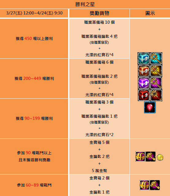 - 本月只要獲得450場勝利即可獲得職業軍備箱10個+職業軍備箱鑰匙4把+光澤的紅寶石*4喔!