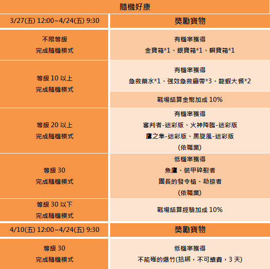 - 隨機好康只要您參與活動的角色等級條件滿足,將有機會同時獲取多項獎勵。20級與30級武器獎勵,每個角色僅能獲得一次。